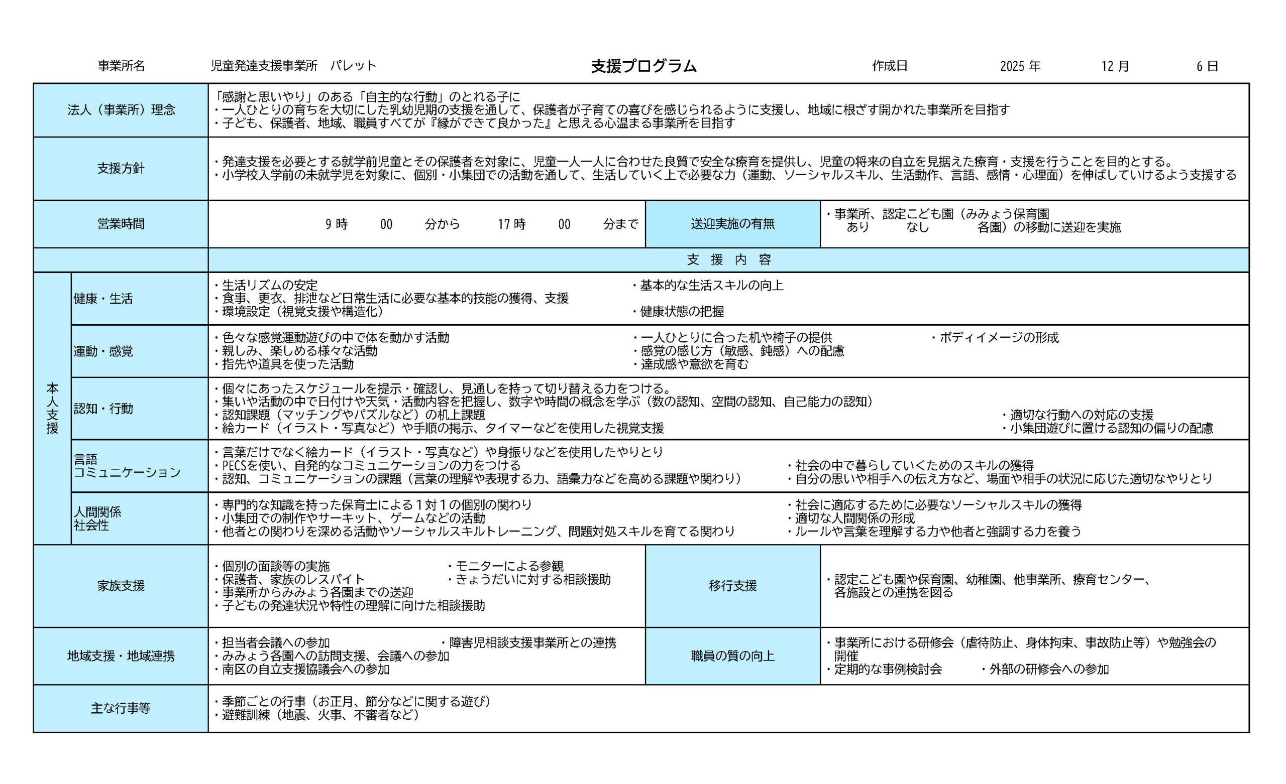 パレットは、お子さん一人ひとりの発達上の課題や障がいの特性に応じた環境を整え、療育を行う児童発達支援事業所です。保育園・幼稚園・保護者の方々と連携・協力しながら、ご本人の強みを活かし、理解しやすく学びやすい支援を行います。その中で、家庭や地域での生活をよりよく送ることができるよう、成長を支えていきます。